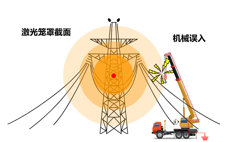 全方位监控输电线路周围外物:激光柱笼罩输电导线,防范肇事机械从任意方向接近导线。